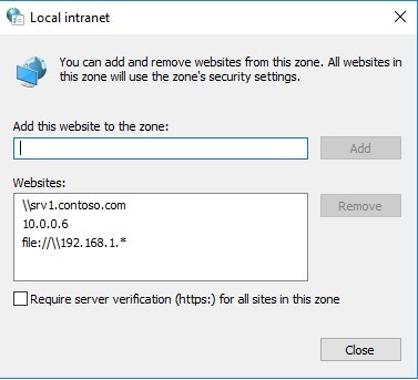 4. In the next window, add a name and/or an IP address of a server. For example, \\10.0.0.6, or \\127.0.0.1\ for a local computer. You can use a wildcard character. For example, you can add all IP addresses of your local network to the Local Intranet zone using the following line: file: //192.168.1.*. .;